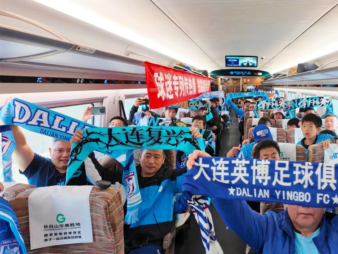 4月22日14时38分,1000余名球迷旅客乘坐G8015次列车从大连北站出发前往沈阳,为客场对战辽宁铁人队的大连英博队加油助威。这趟列车是中国铁路沈阳局集团有限公司为满足球迷个性化出行需求定制开行的“球迷专列”。