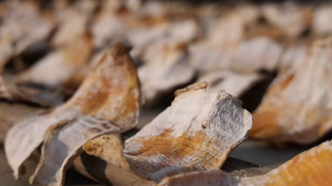沥干的笋摊在竹匾上晒三四天,从白变黄再变褐。晒好密封保存,七八月再晒一次防潮,过年拿出来做勒笋烧肉,香气十足。