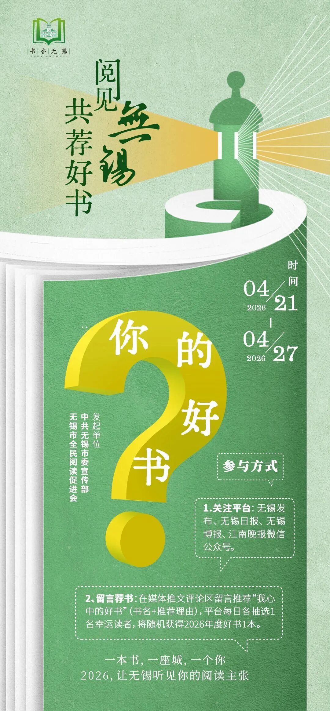 为进一步扩大无锡市“全民阅读活动周”暨第19届太湖读书月活动的影响力和传播力,在无锡市全民阅读促进会推荐的2026年度11本好书基础上,现发起全民共荐“第12本好书”活动。