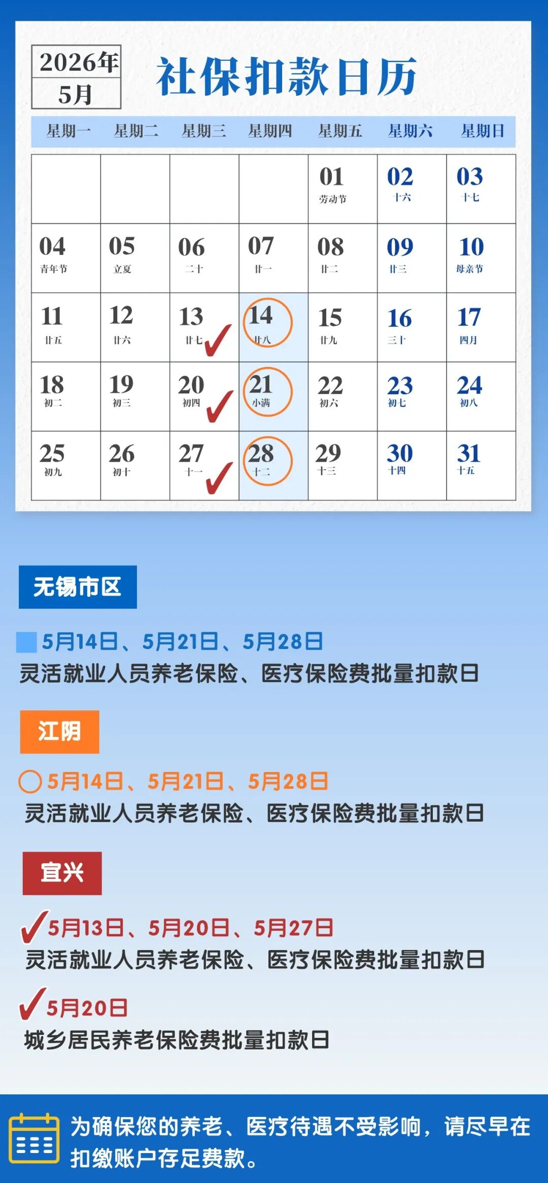 无锡市2026年5月社会保险费批量扣款时间安排已公布,请注意查收相关信息!