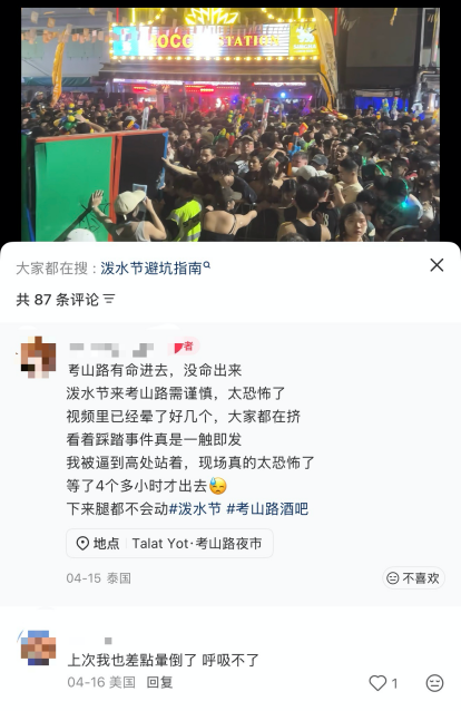 笔者亲身体验发现,风险主要集中在两方面:一是极端拥挤的安全隐患,曼谷考山路高峰时段人流密度极高,网友戏称“有命进去,没命出来”,易致缺氧、体力透支,甚至踩踏风险;二是交通环境的不确定性,泼水节期间向行驶车辆泼水成常态,导致驾驶员视线受阻,引发交通事故。