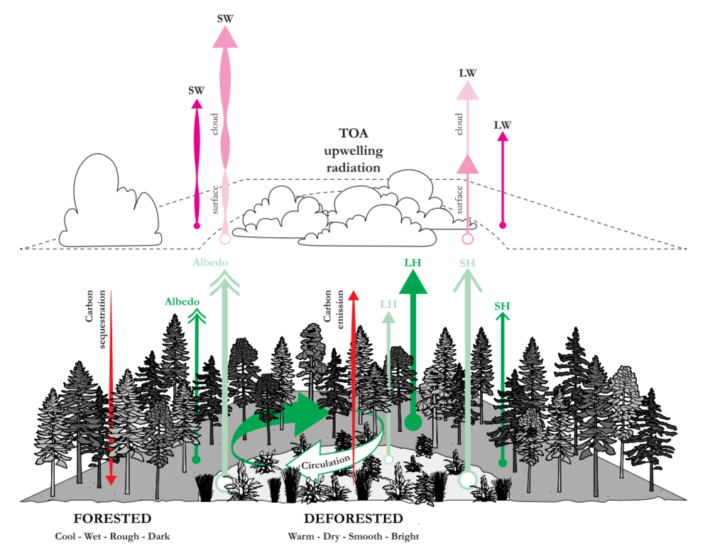 短波(阳光)方面:更多低云反射阳光回太空,加上砍伐区地表变亮(反射更多),使大气顶部上行短波辐射显著增加——即“冷却”。