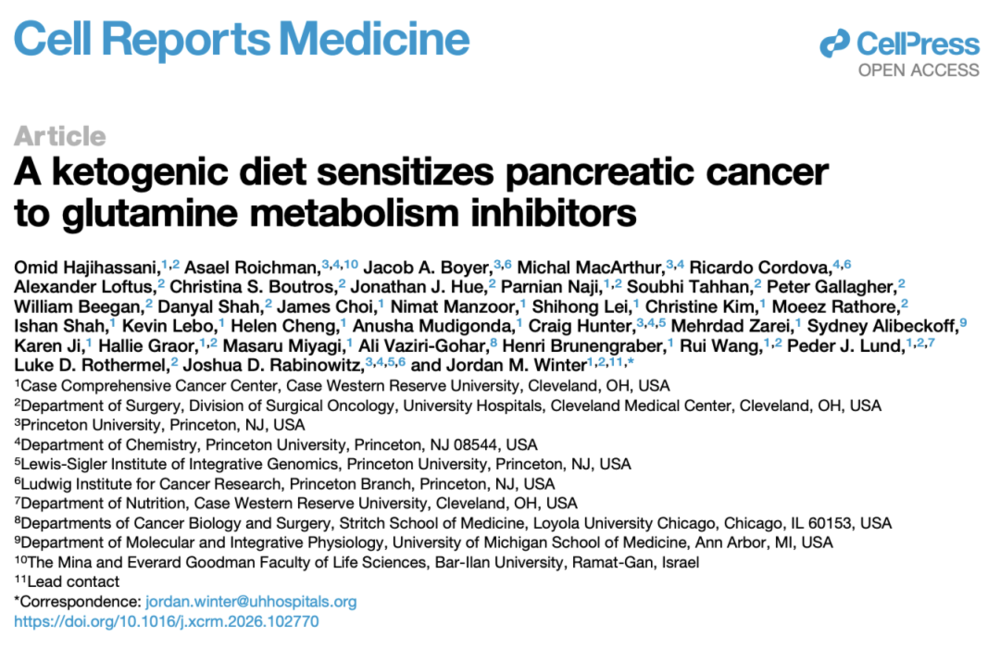 2026年4月23日,凯斯西储大学的研究人员在Cell子刊《Cell Reports Medicine》发表了题为《A ketogenic diet sensitizes pancreatic cancer to glutamine metabolism inhibitors》的研究论文。