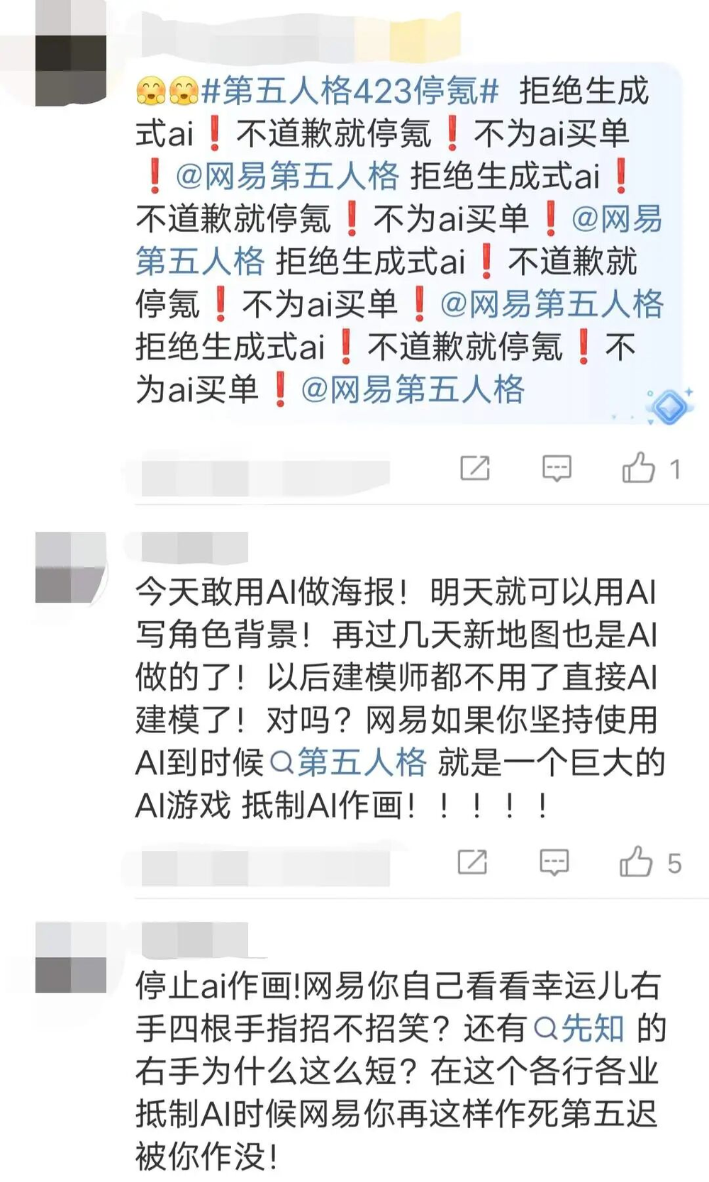 愤怒的玩家在《第五人格》官方微博留言,要求游戏“停止使用AI”“停止试探”“重新画海报”,“拒绝生成式AI,不道歉就停氪,不为AI买单”。部分玩家选择在4月23日停氪,这一天是“画家”角色的生日。他们希望通过这种方式,换回官方的声明与道歉,让人类创作重新主导游戏美术。
