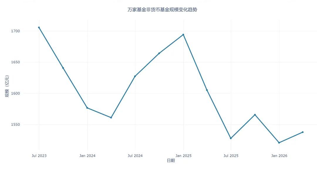 更值得注意的是,近三年非货币基金规模不升反降,从2023年一季度的1797.26亿元下滑至2026年一季度的1537.76亿元,降幅达14.44%。