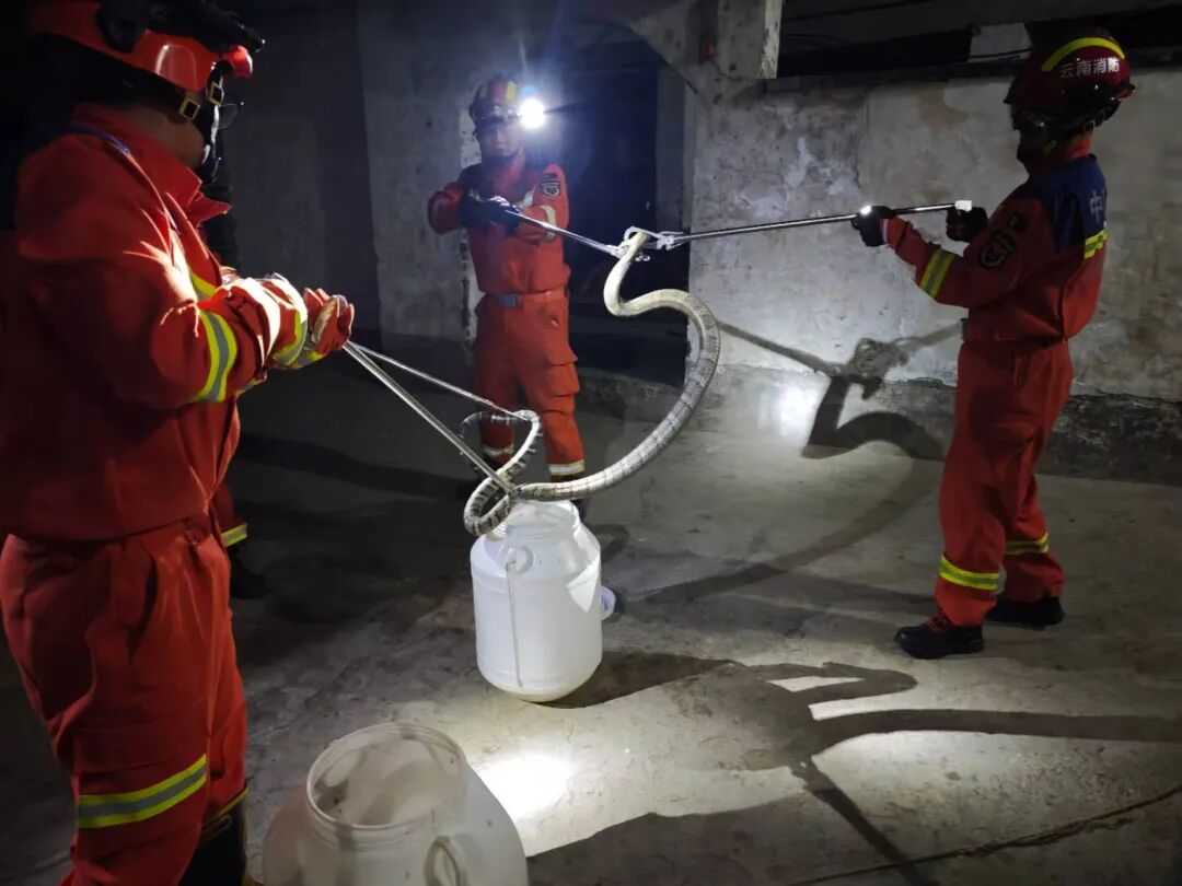 根据现场情况,消防员手持捕蛇器小心靠近,找准时机迅速出击,牢牢夹住大蛇,将其带出卧室装入桶中。