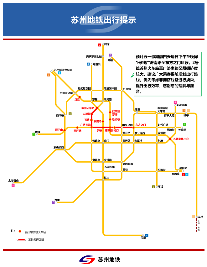 预计“五一”期间东方之门、拙政园苏博、石路、山塘街、苏州火车站等车站将出现进出站大客流。苏州地铁会密切关注线网客流情况,视现场情况采取列车多停、备车加开、跳停等行车调整措施;相关车站也将根据需要采取出入口调整、限流、关站等客流管控措施,敬请乘客理解并积极配合。