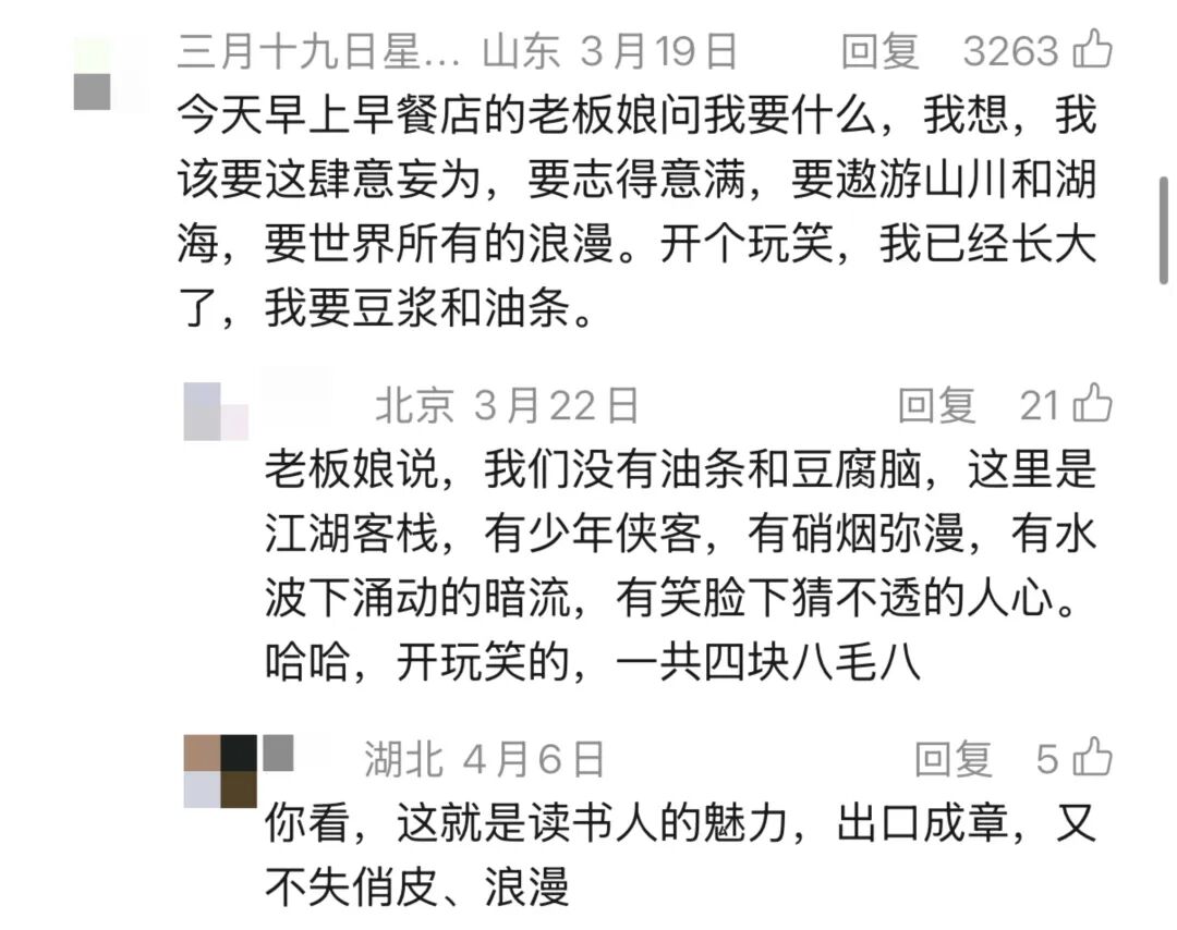 今天早上早餐店老板娘问我要什么,我想,我该要肆意妄为,要志得意满,要遨游山川湖海,要世界所有的浪漫。开个玩笑,我已经长大了,我要豆浆和油条。