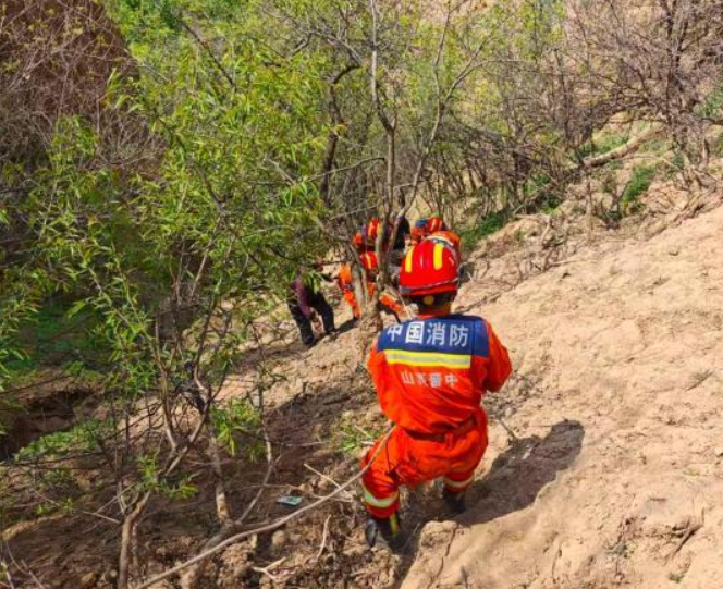 灵石消防救援大队接到报警后,迅速调派14名救援人员展开搜寻。途中,报警人接到亲戚电话,称在老人常去的田地呼喊时得到了回应。救援人员赶到该区域后侦察发现,老人被困在落差约30米的沟底。