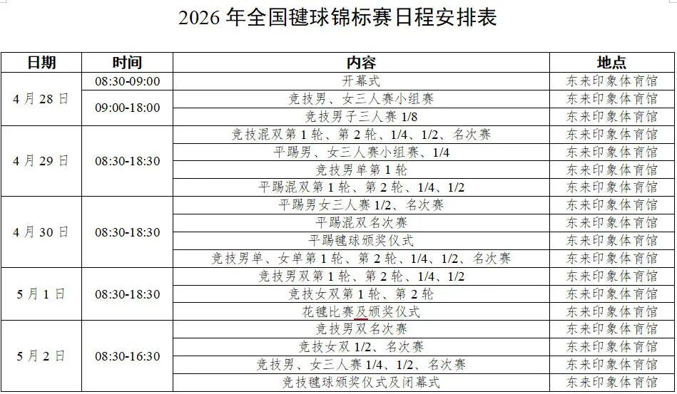 为期5天的赛程里,众多毽球高手将齐聚一堂。无论是毽球运动的爱好者,还是想要感受竞技体育热血氛围的市民,这场精彩赛事都值得关注。