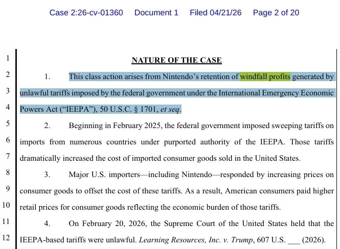 就在路透社发布该报道的同一天,任天堂美国公司向美国法院提起诉讼,要求政府全额退还关税、利息及律师费,称这笔款项本应‘物归原主’。