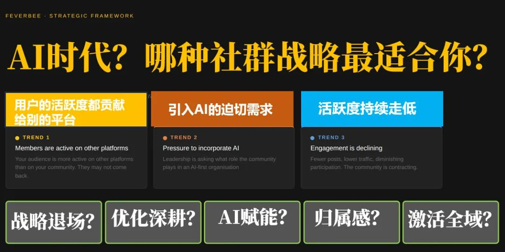 这些战略并非互斥,品牌可根据自身资源和目标组合选择。关键是要主动评估趋势影响,制定清晰规划,避免被动躺平或盲目跟风。只有选对长远赛道,才能在AI时代实现品牌社群的有效破局。