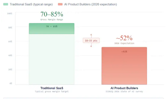 这并非危言耸听,行业数据早已敲响警钟。知名机构ICONIQ发布的2026年AI行业报告明确指出:当前全面搭载AI功能的产品,平均毛利率仅约52%,与传统SaaS的毛利水平形成巨大断层。
