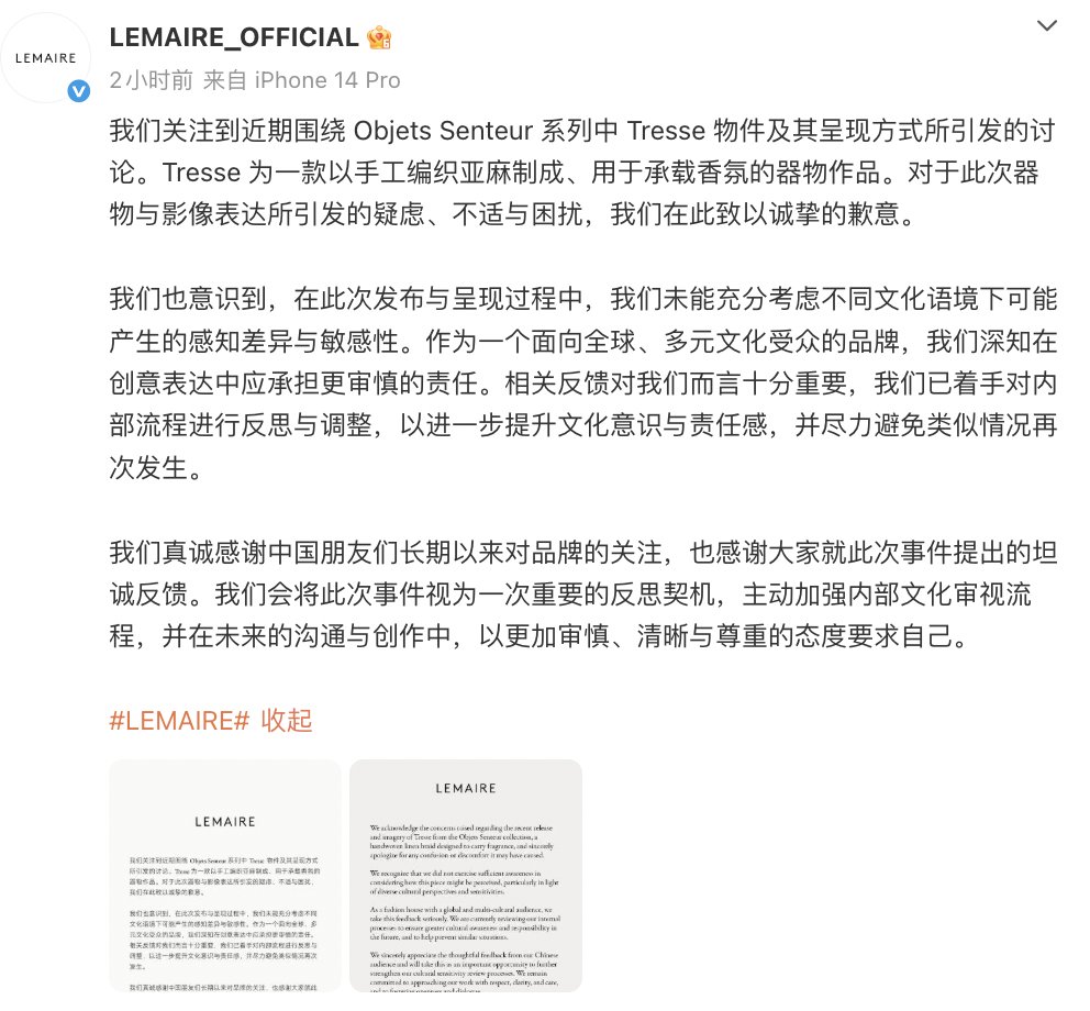4月26日,品牌官方账号@LEMAIRE_OFFICIAL 发布致歉声明: