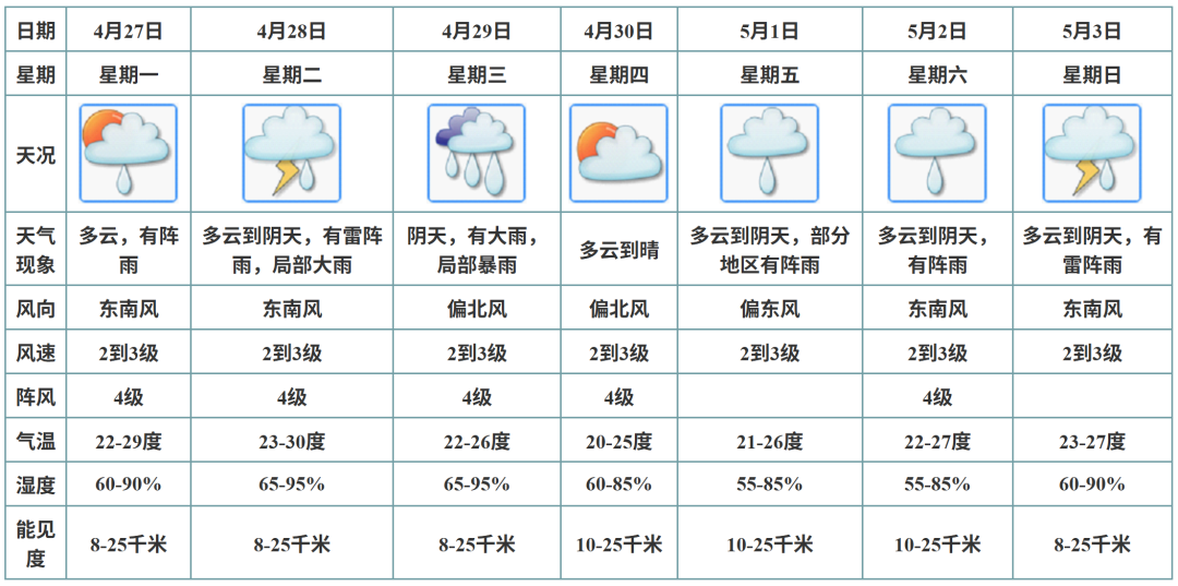 4月29日,珠三角中东部、河源、梅州、粤东市县有大雨,局部暴雨,其他市县多云有阵雨。最高气温:南部市县24~27℃,其余市县20~24℃。