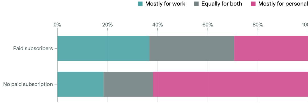 付费用户(含自费和企业买单)中,工作用途占比接近80%;免费用户中这一比例仅约38%。细分来看,自费订阅者为58%,企业买单用户达76%。