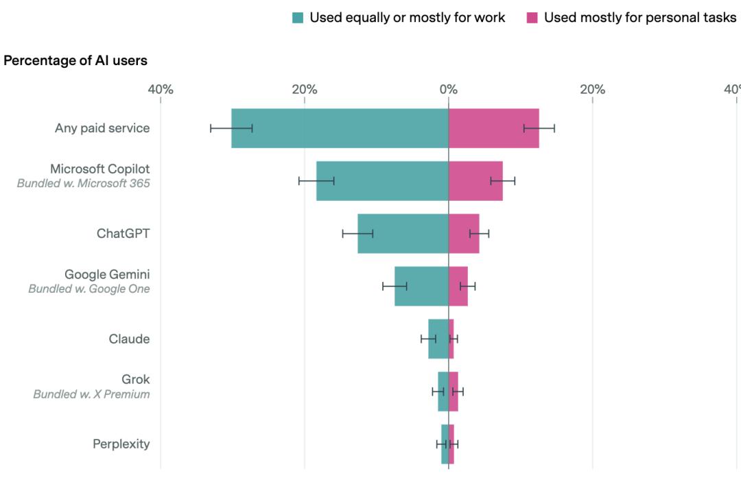 调研还发现:50%的职场AI用户仍依赖个人订阅或免费版本,仅33%使用企业提供的AI服务。