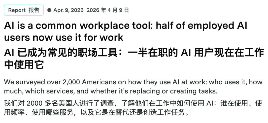AI普及已无悬念,半数美国人都在使用。但在“如何使用”上,出现了清晰裂缝:一端是将AI当搜索引擎、每周使用几次的轻度用户;另一端是用AI重新定义工作内容的人,有人失去旧任务,有人获得新能力。