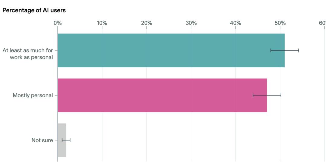 在使用AI的职场人中,51%将AI用于工作的频率不低于个人用途(青色),47%仍以个人用途为主(粉色)。AI正从娱乐工具向生产力工具转变。