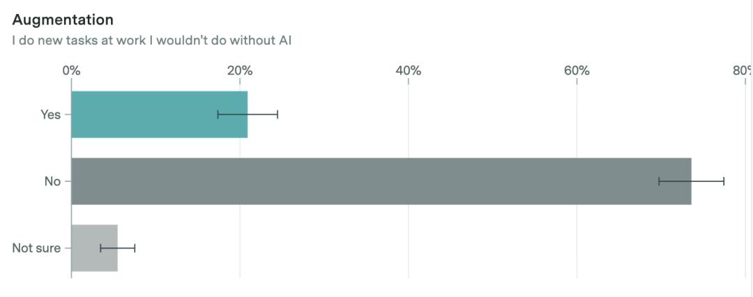21%的人指出,AI让他们能够开展以往无法完成的新任务,例如无需编程即可完成数据分析。