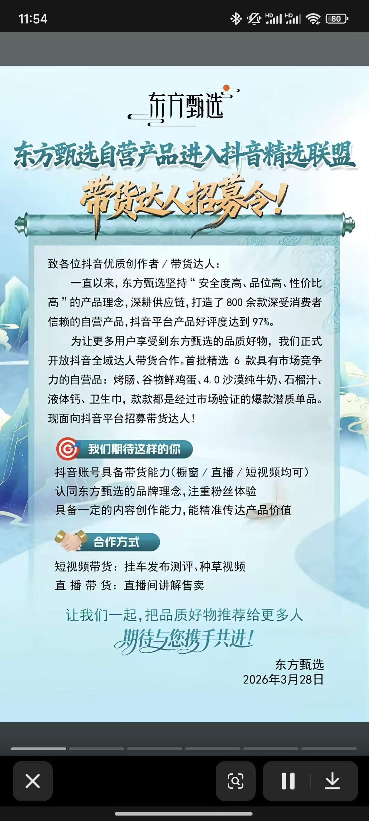此外,3月28日东方甄选APP发布“带货达人招募令”,开放抖音全域达人带货合作。公告称:“现面向抖音平台招募带货达人!我们期待这样的你:抖音账号具备带货能力(橱窗/直播/短视频均可),认同东方甄选品牌理念,注重粉丝体验,具备一定内容创作能力,能精准传达产品价值。”