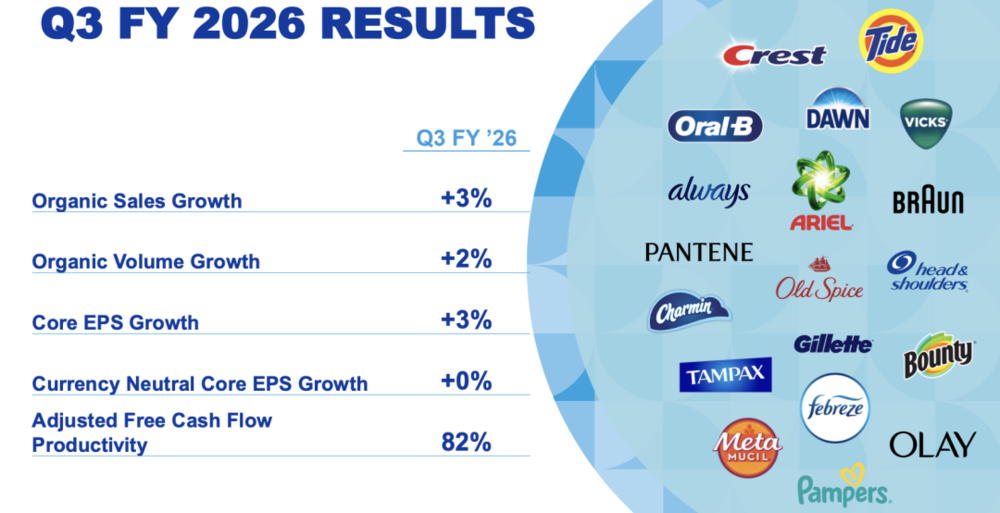2026财年第三季度,宝洁净销售额达212亿美元,同比增长7%;有机销售增长3%,其中销量贡献2个百分点,价格贡献1个百分点。核心每股收益1.59美元,同比增长3%。