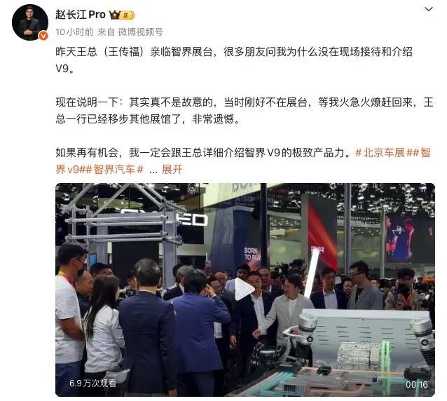 直到车展次日,赵长江才无奈发文解释:“当时我刚好不在展台,等我匆忙赶回来时,王总一行已经前往其他展馆了,实在非常遗憾。”
