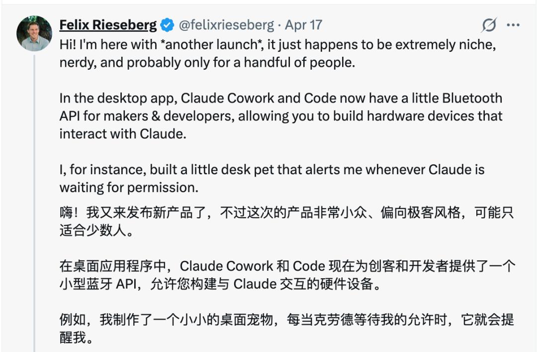 这是Anthropic工程师Felix Rieseberg发起的开源项目,名为Claude-Desktop-Buddy。