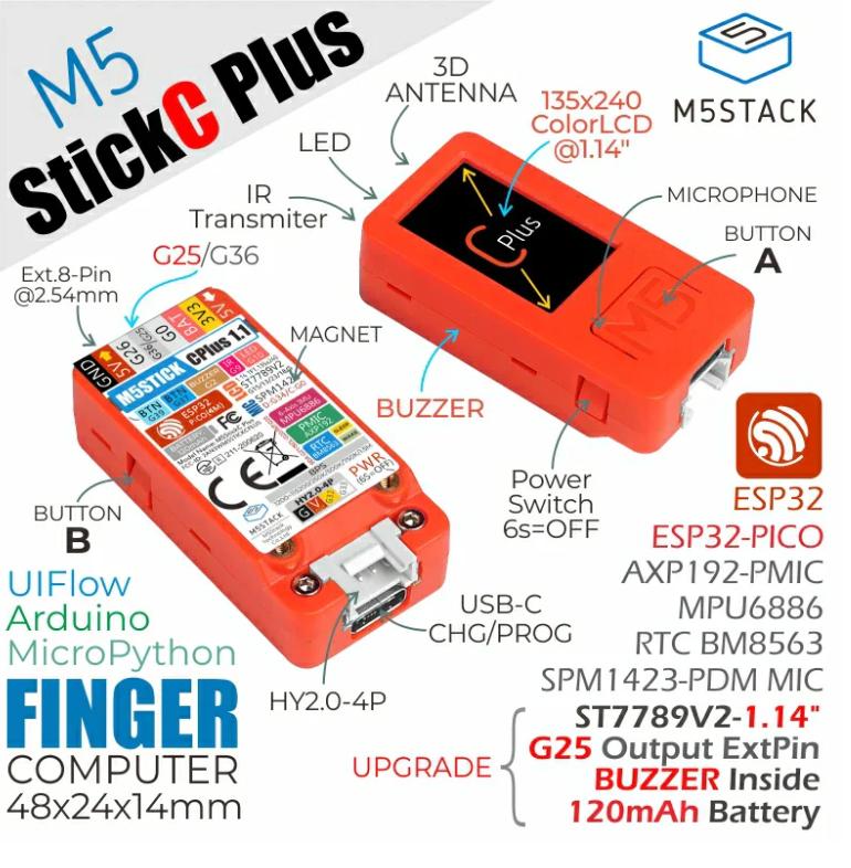 该项目的官方参考硬件是深圳公司M5Stack(明栈科技)的M5StickC Plus,芯片则采用上海乐鑫科技的ESP32。