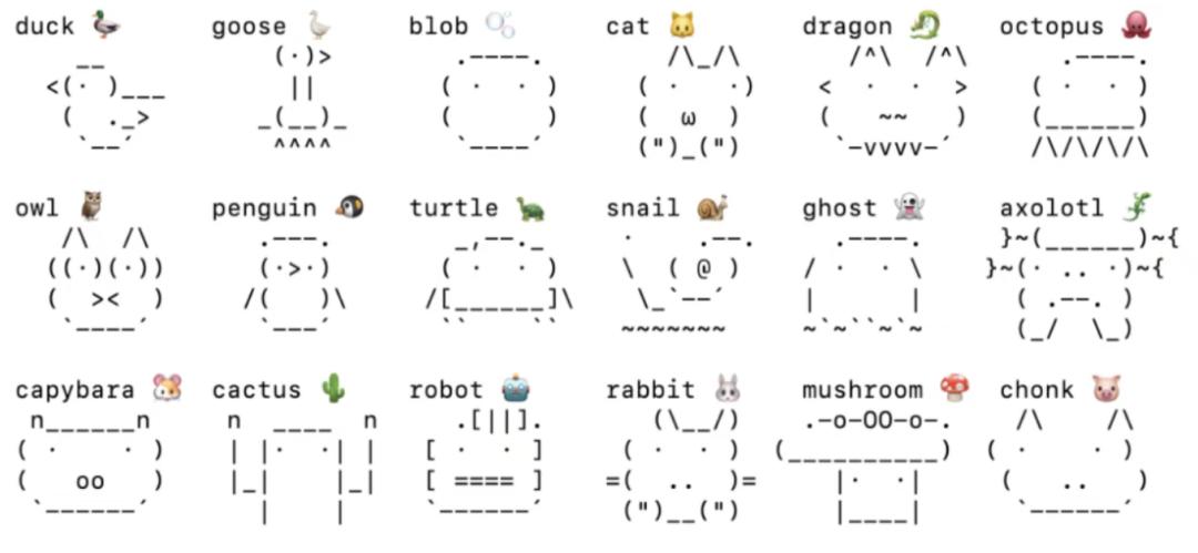 它内置18种ASCII小动物形象,源自Claude Code此前源码泄露的宠物系统,每种形象都有完整动画: