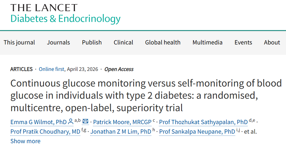 [1]Emma G Wilmot,Patrick Moore,Thozhukat Sathyapalan,et al.Continuous glucose monitoring versus self-monitoring of blood glucose in individuals with type 2 diabetes:a randomised,multicentre,open-label,superiority trial.The Lancet Diabetes&Endocrinology.Published April 23,2026.DOI:10.1016/S2213-8587(26)00076-8