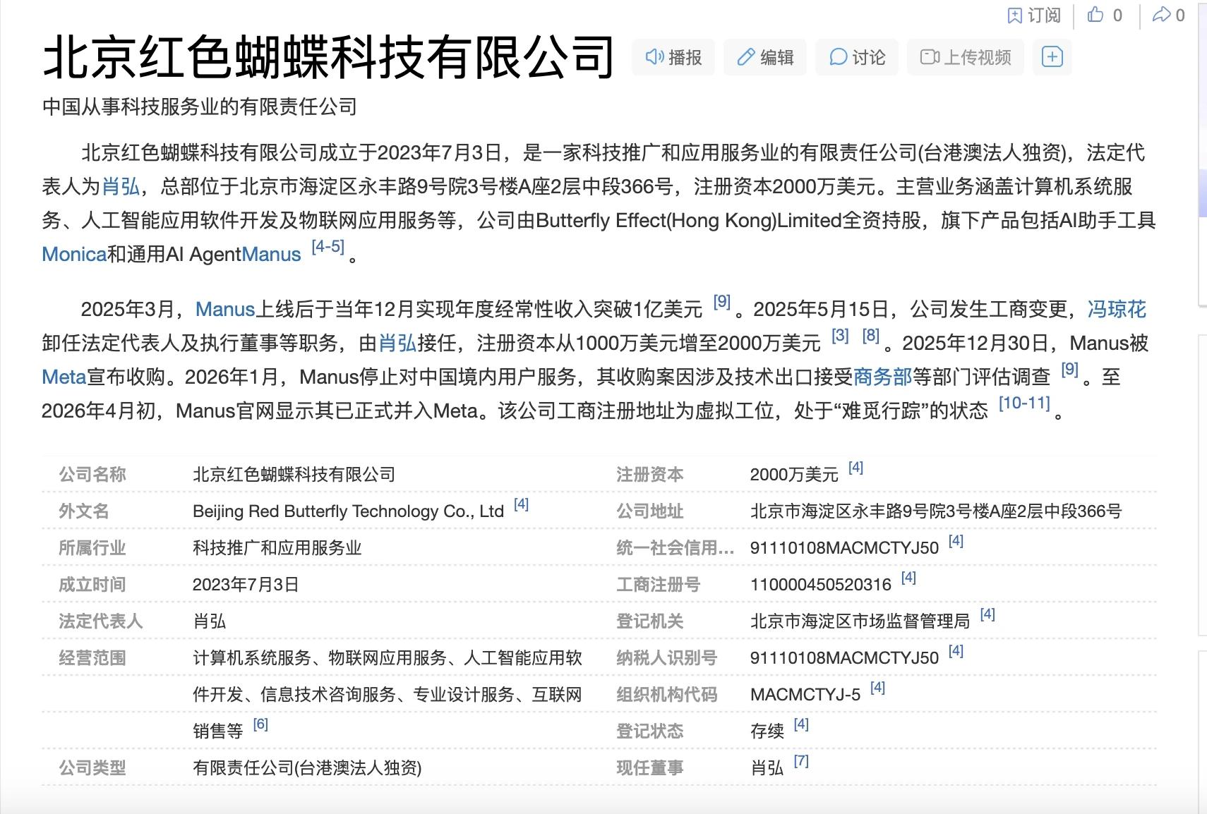 在国内,Manus的运营主体是北京红色蝴蝶科技有限公司,法定代表人为肖弘。该公司成立于2023年7月,注册资本2000万美元(实缴455万美元),由香港公司Butterfly Effect(Hong Kong)Limited全资控股。早期,Manus还在北京、武汉设立了办公室。