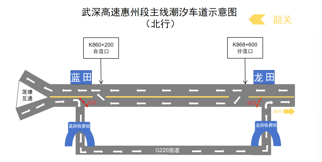 通行指引:武深高速往韶关方向车辆,在龙田收费站以北K868+600处的“借道通行分流口”分流,第1车道小型车通过该分流口进入对向车道,借用对向三车道向北行驶,至蓝田收费站以南K860+200处的“借道通行合流口”合流后继续往韶关方向;武深高速往深圳方向车辆,行至蓝田收费站路段时,需经蓝田收费站驶出高速,沿220国道向南行驶至龙田收费站,再驶入武深高速继续向南。
