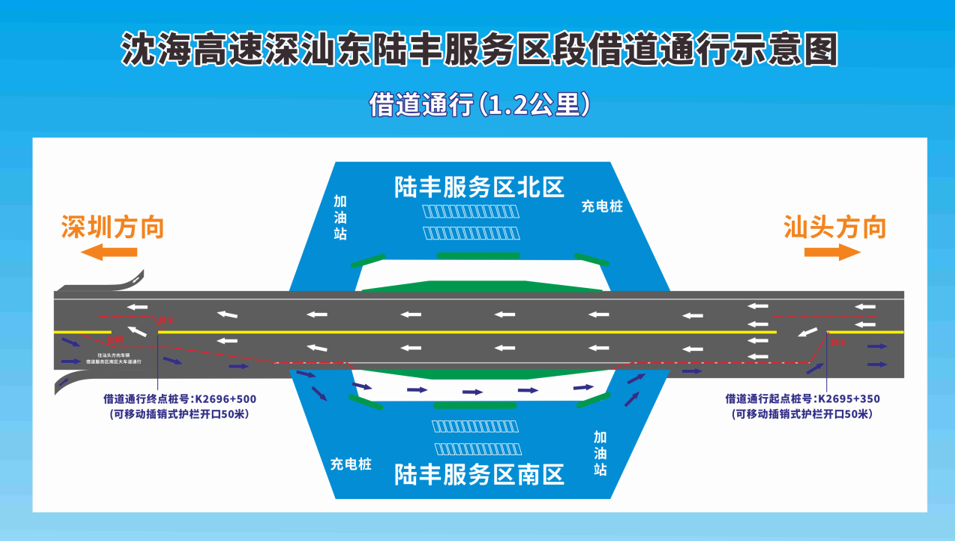 通行指引:实施期间,沈海高速西行(往深圳方向)陆丰服务区路段将启动1.2公里借道通行措施。工作人员会打开该路段西行与东行方向间预留的中央隔离护栏开口,引导西行拥堵车流借用对向车道通行,通过服务区路段后返回西行原路。同时,为保障安全,原东行(往汕头方向)车流及从霞湖收费站上高速往汕头方向的车流,将统一引导进入陆丰服务区南区,经服务区内部道路绕行后,重新汇入高速主线继续行驶。