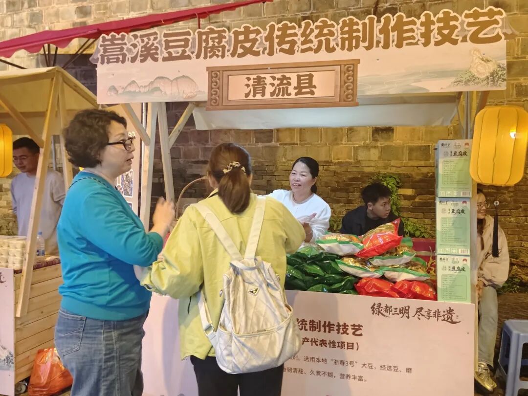 进士巷设置21个非遗市集展位,分为美食区与手工艺文创区。在这里,既能品尝三元米雾熏鸭、将乐红糖、建宁通心白莲等非遗美食,也能体验清流长校打锡、宁化客家剪纸、明溪微雕、泰宁杆秤制作等传统技艺,还可选购永安大腔戏文创、青水畲族纹样设计等特色产品。尚书街沿街设有9个美食体验点,汇聚将乐擂茶、沙县小吃、清流嵩溪豆腐皮、永安青水畲族糕点及泰宁游浆豆腐、碧玉卷等风味,一条街即可尝遍三明特色。