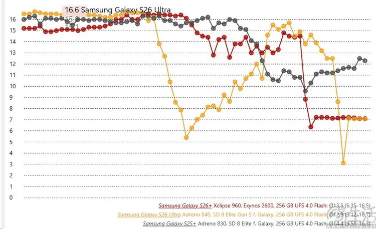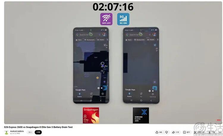 Android Addicts的续航测试中,搭载Exynos 2600的Galaxy S26 Ultra续航时间,比同配置的第五代骁龙8至尊版机型少了近30%。