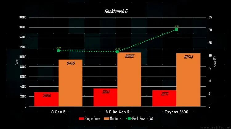 比如TechStation365用GeekBench 6测试发现,Exynos 2600的峰值功耗高达30.22W,比第五代骁龙8至尊版高出40%以上。