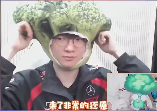尽管存在语言障碍的问题,但FAKER非常努力地配合直播过程,甚至主动“整活”,拿出一件花椰菜头套戴在头上,复制西兰花表情的经典场景,也让网友们想起了他与花椰菜的关系,直播间的直播效果十足。