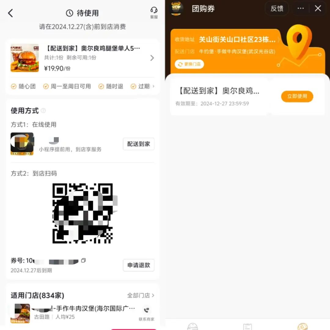 以开通随心团的汉堡产品为例。用户购买团购套餐后,可以进店核销取餐,也可以选择直接配送,60天内可以随时预约配送。但不同于过去可以直接在订单页面填写地址并预约配送时间的团购配送方式,随心团产品的配送服务需要在订单页面中点击跳转到商家的小程序中进行最终的配送订单。