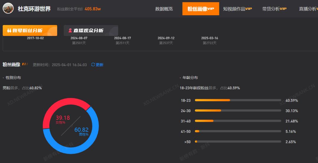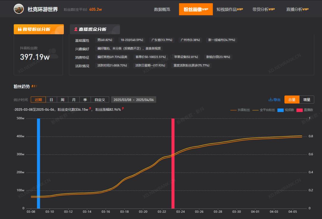根据新抖数据,“杜克周游世界”抖音账号从2022年开始稳步更新日常旅游,直到2024年9月,两年内粉丝数量才增加到30万,而今年3月,杜克拍摄一哥的视频爆红,粉丝数量在一个月内增加到405万,并被提升为头部旅游博主。