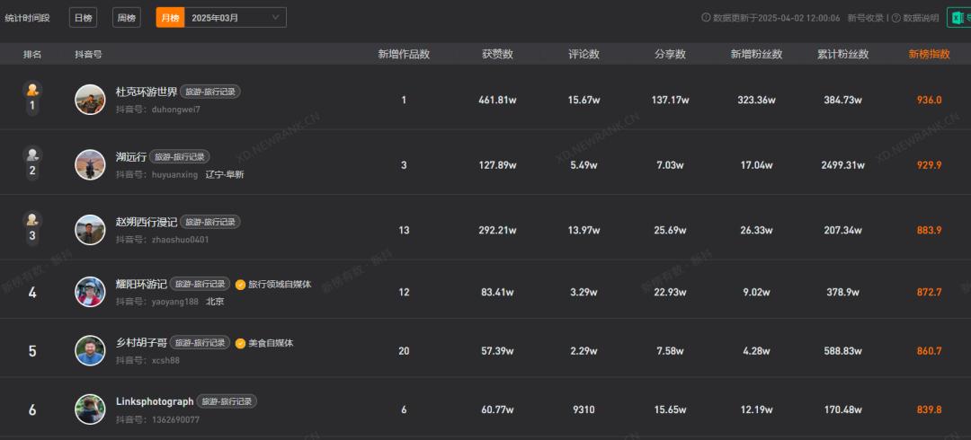 以3月份新抖统计的热门旅行记录类博主为例,排名前三的博主分别是“杜克周游世界”、湖泊远行和赵朔西行漫记。