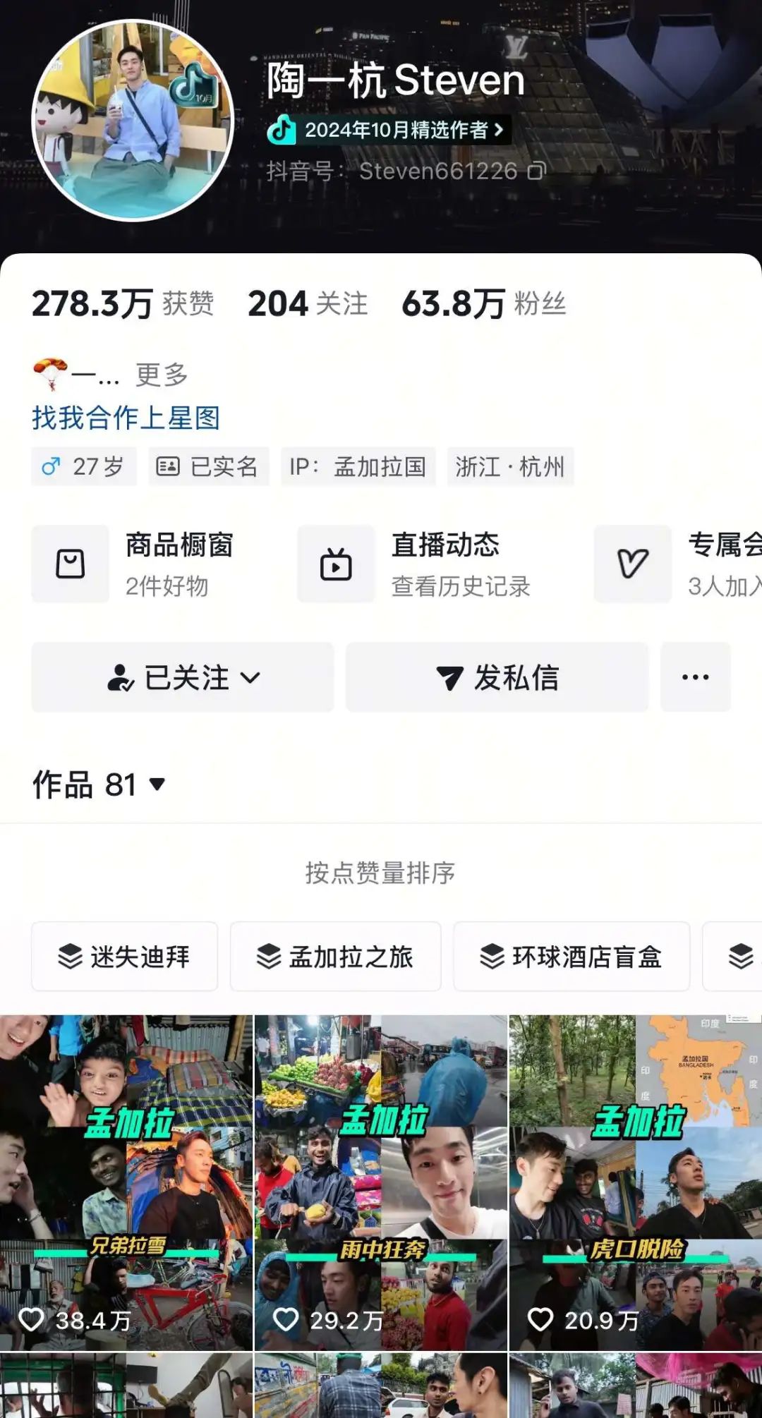 新抖数据显示,从去年9月到11月,“陶一杭Steven”发布了10多个孟加拉旅游视频,他还利用这三个月的粉丝数量从不到10万增加到50多万。,扩大知名度。离开孟加拉后,“陶一杭Steven”粉丝增长放缓,目前其抖音账号粉丝数量达到63.8万。