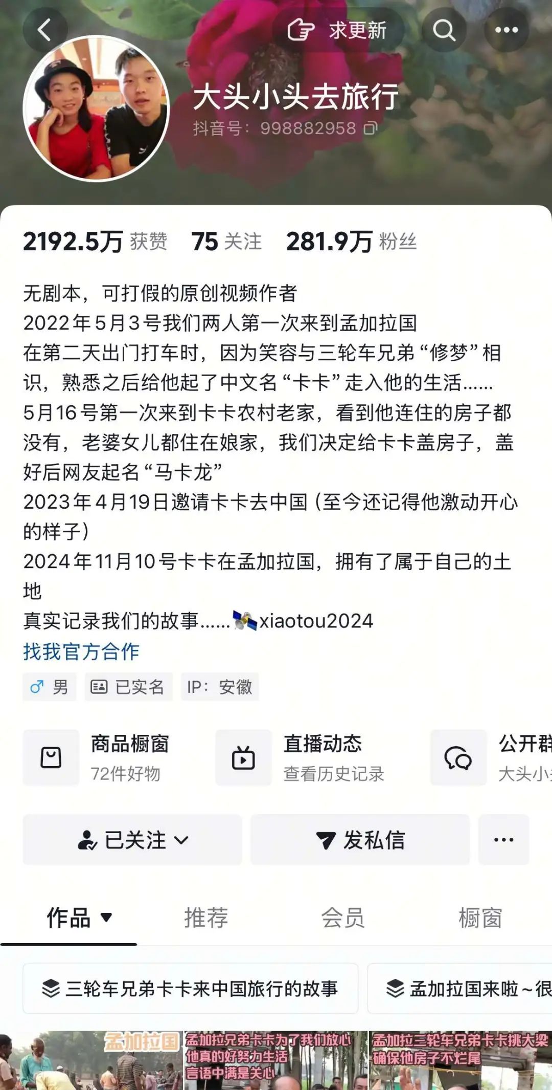 孟加拉旅行时,“大头小头旅行”认识了人力车夫“卡卡”。他们不仅帮卡卡盖房子,开超市,还带他去中国旅游,深度参与卡卡的生活,以此为素材不断拍摄视频。目前,抖音的粉丝数量已经达到281万。