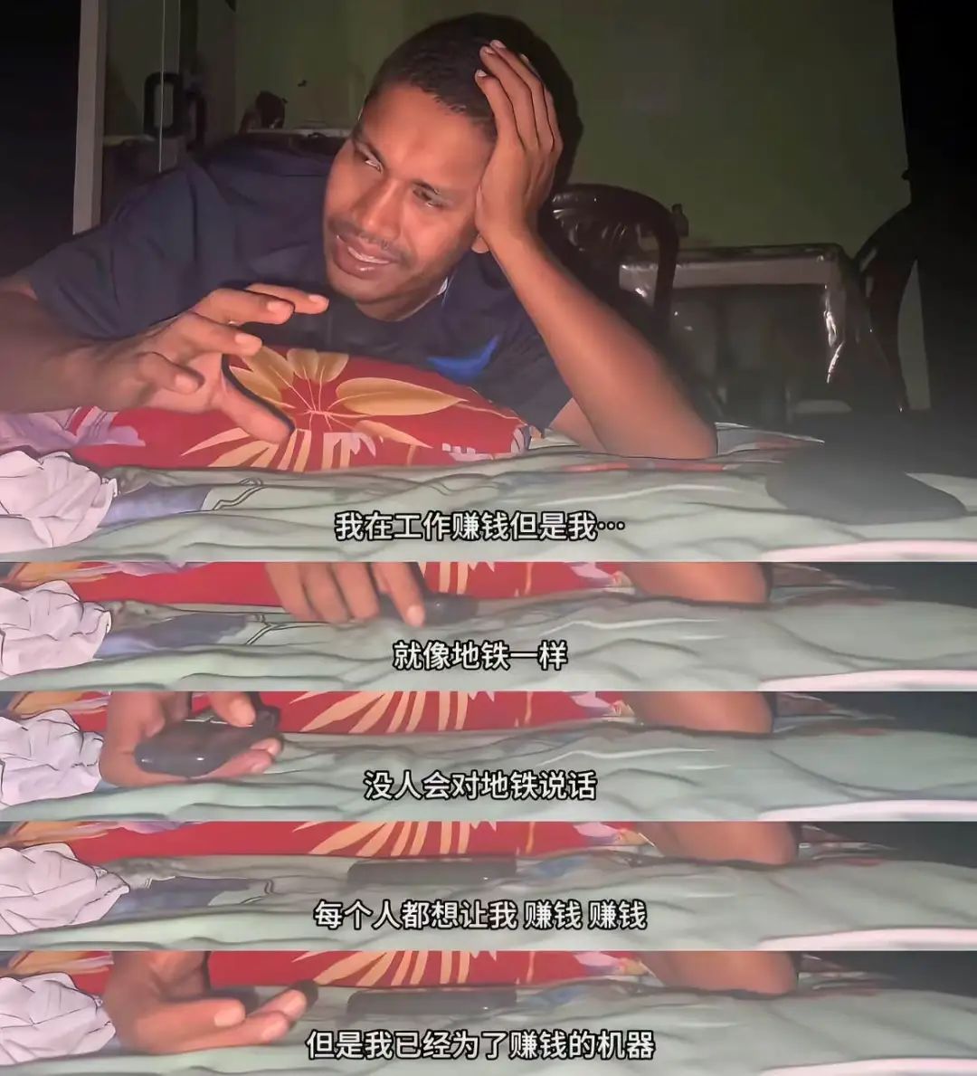 晚上和杜克聊天的时候,一个哥哥说:“我挣的钱是给妈妈和老婆的,但是他们不会问我你吃了没有,身体怎么样。每个人都想让我赚钱。我已经成为一台赚钱的机器。”
