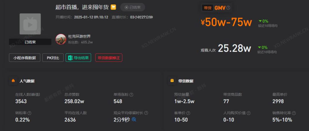 此前,杜克的收入来源主要依靠投资合作和直播销售商品。新抖数据显示,1月12日,“杜克周游世界”直播预计销售额仅为50-75万。