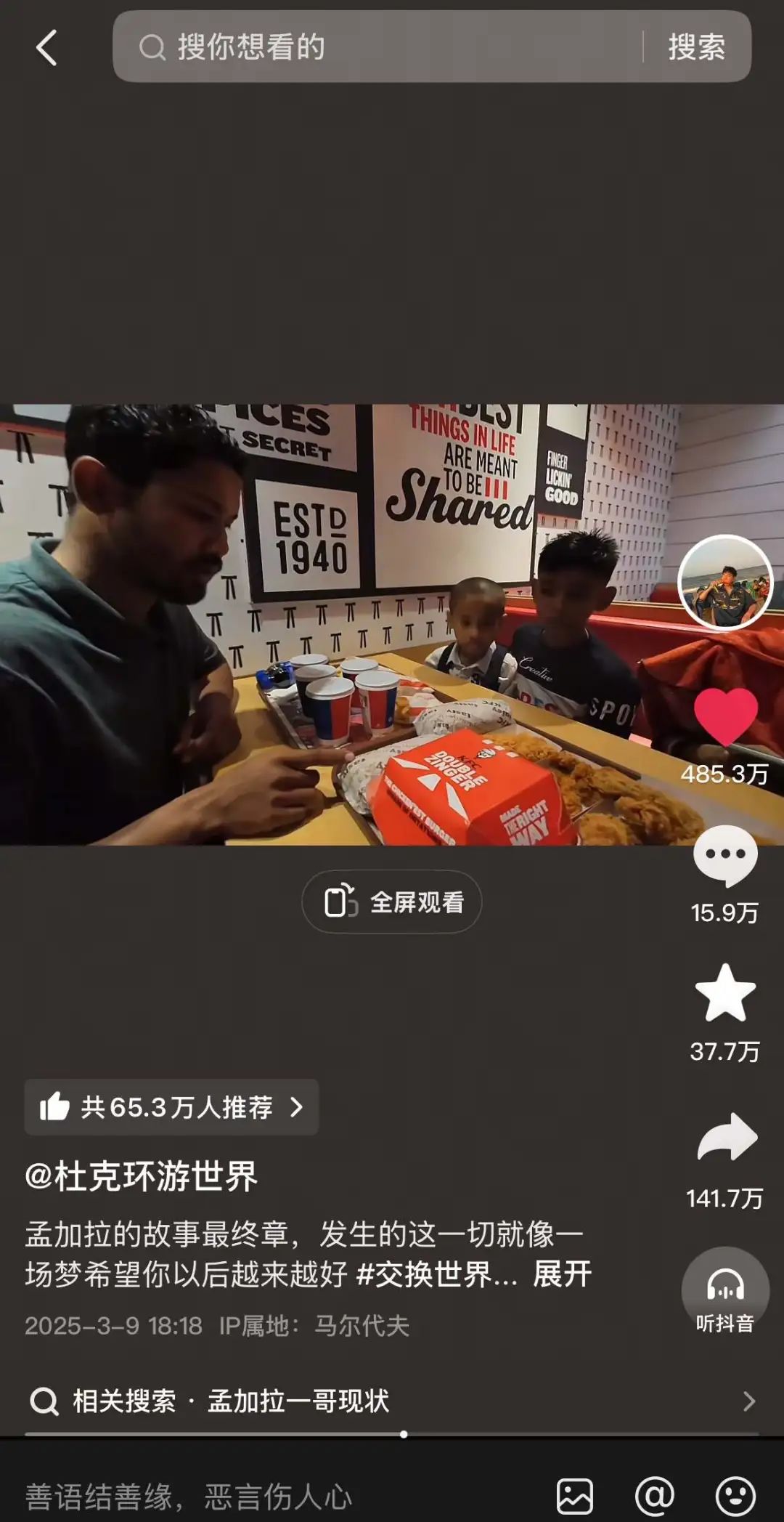 这个视频出人意料地爆红了,一哥的经历引起了国内网友的共情。现在,该视频在抖音上的赞数达到了485万,在哔哩哔哩的播放量达到了724万。