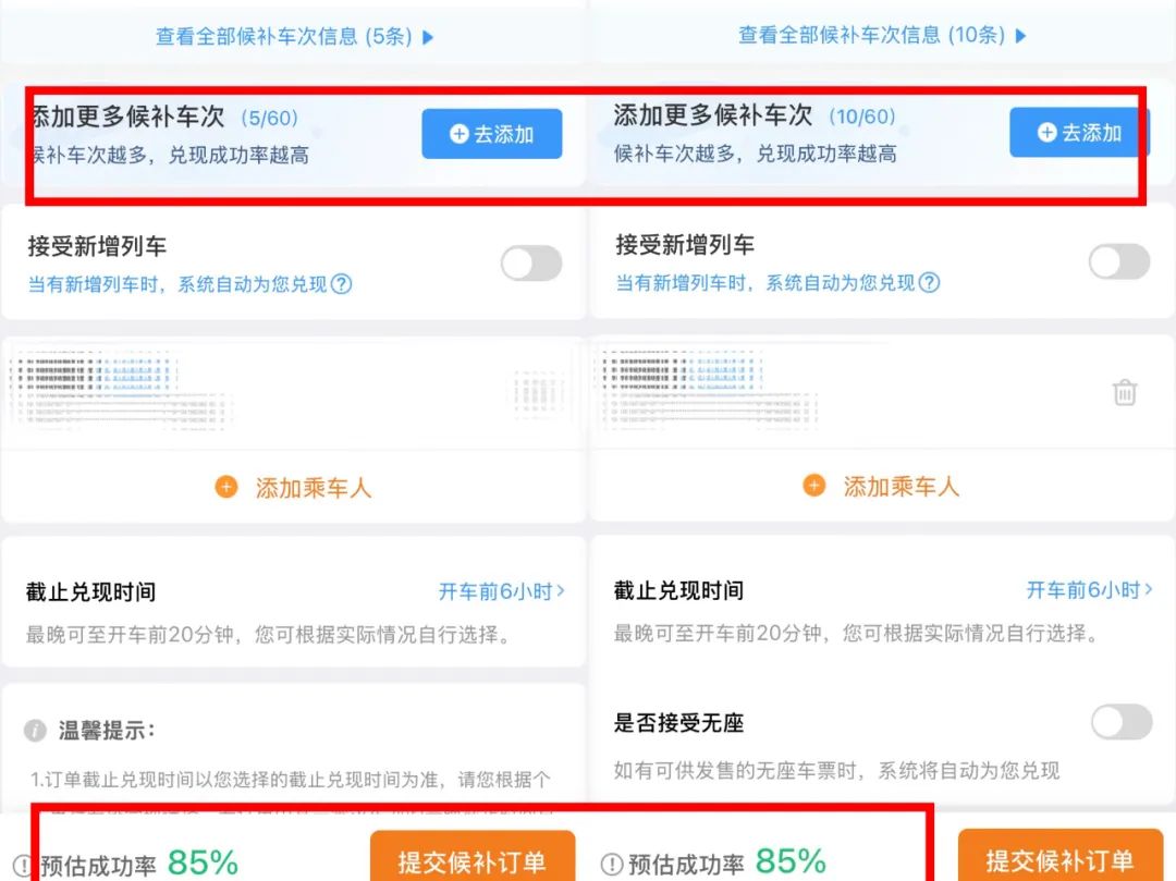 替换5班次和10班次的成功率来自85%:12306App截图