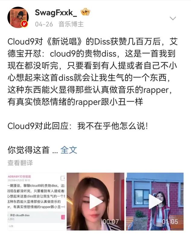 同样,凭借一首Diss贴脸放大的爱奇艺《中国新说唱2025》,说唱新手 Cloud9的确从“查无此人”的状态被圈内知道,被戏称为“辗压VaVa”、下一个VaVa”;而且还借此机会获得了胡彦斌认证,直播推广了腾讯视频的新音综合《让我唱》。