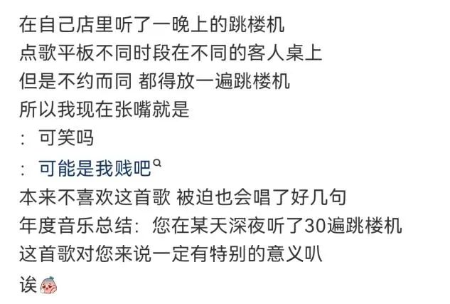 比如目前流行的“跳楼机”,“可能是我便宜/不爱我的人要上楼/我们的感情就像跳楼机/让我突然起飞,以极快的速度落地”被吐槽为小学生歌词和非主流QQ空间签名,“还不如大碗宽面合理”等等。