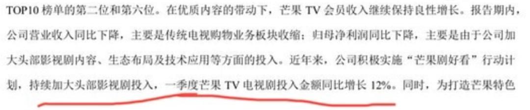 正是这样,芒果TV才开始在剧集领域奋起直追,前所未有的投资规模也直接体现在财务报告上。财务报告显示,“归母净利润同比下降,主要是因为企业在影视内容、生态布局、技术应用等方面的投入增加。近年来,公司积极实施“芒果剧好看”行动计划,不断增加对头部影视剧的投入。第一季度,芒果电视剧的投入同比增长12%。"